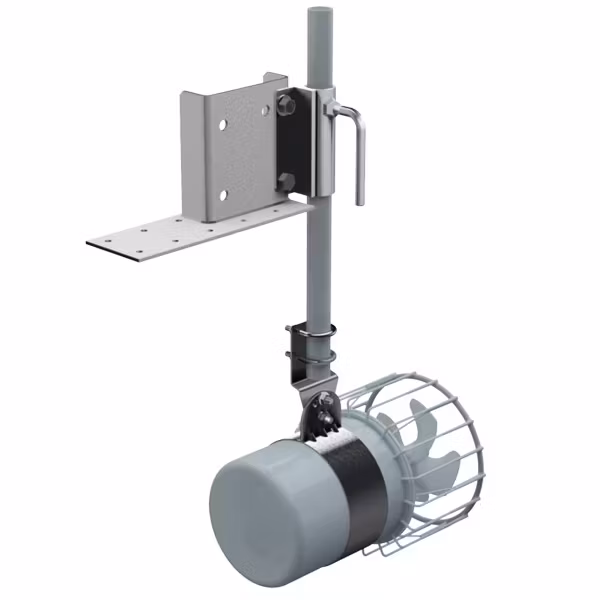 Fäste i galvaniserad stål för montering av Kasco De Icer vid brygga. Fästet kan vinklas från vertikalt till horisontellt läge, och vinkeln på De Icern kan också