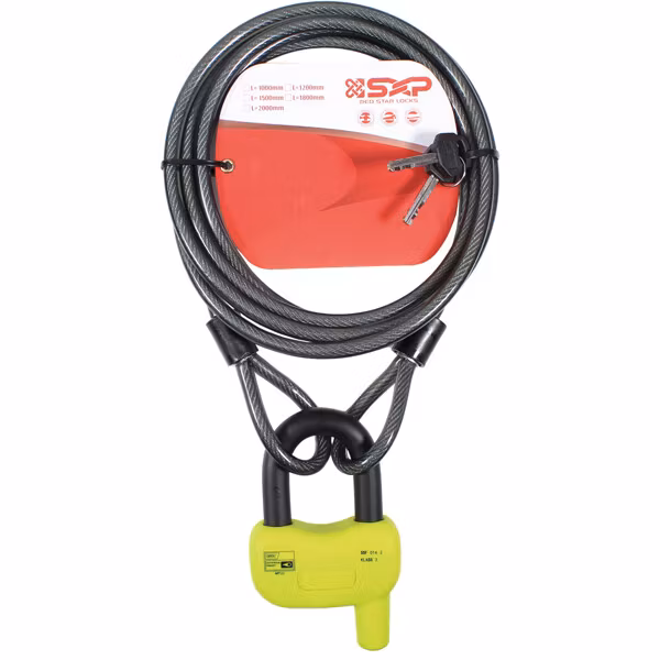Levereras komplett med ett stort och rejält bygellås i en väl synlig färg och 3 meter plastbelagd, härdad ståltråd med öglor i båda ändar.