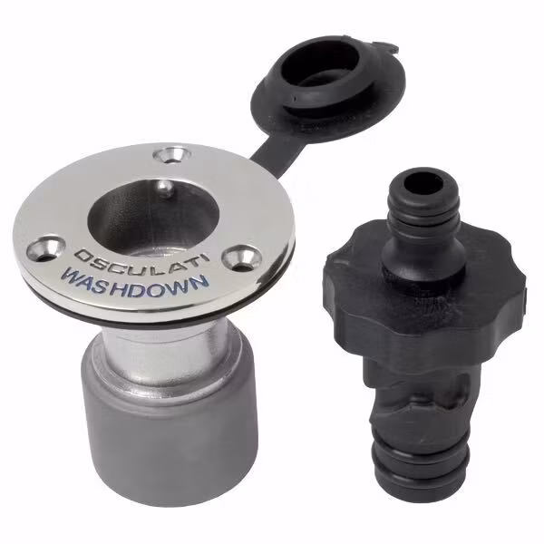 Snyggt helgjutet rostfritt stål, AISI 316 däckgenomföring för anslutning av spolslang.