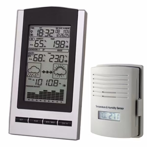 Med den här väderstationen kan du enkelt mäta inom- och utomhustemperatur och luftfuktighet. Den har en barometer och möjlighet att förutsäga vädret, baserat på förändringar i barometertryck och temperatur. Det går även att spara min.-/maxvärden. Utomhussensorn har också en display som visar temperatur och luftfuktighet.