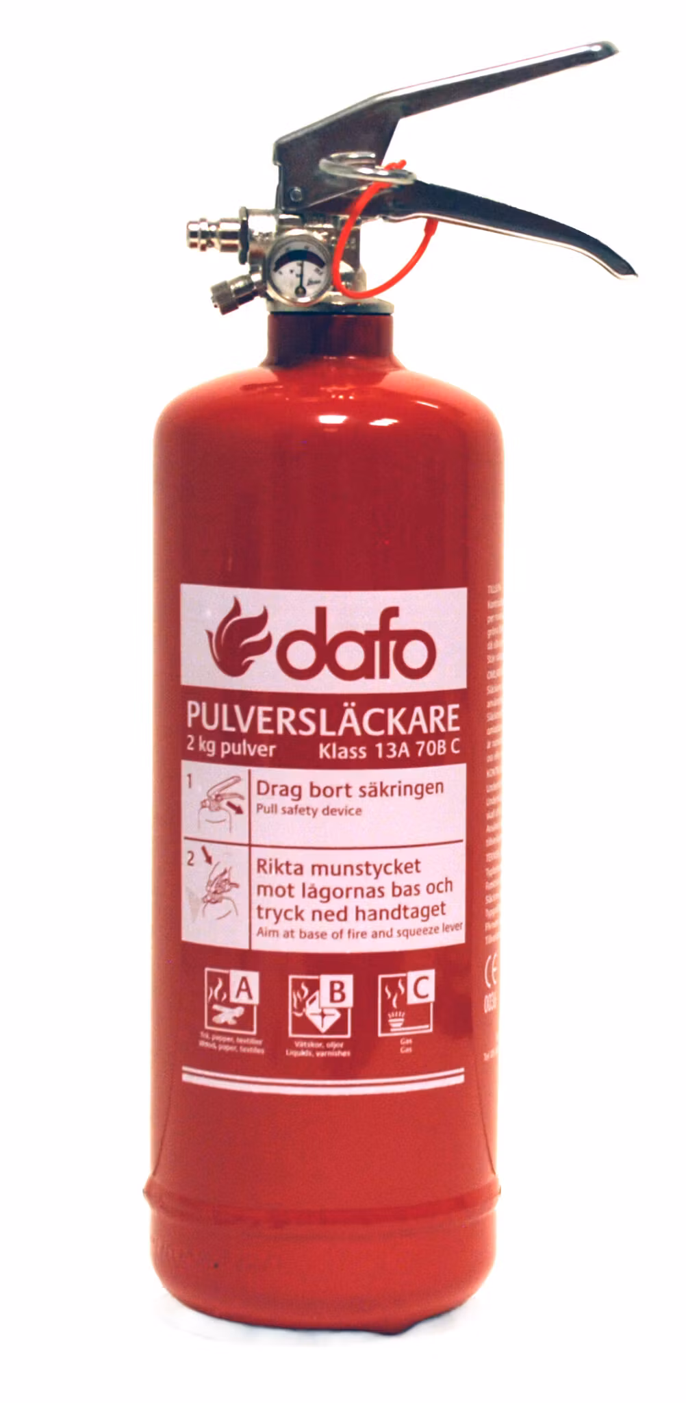 Pulversläckare på 2 kg som är försedd med mässingsventil, bärhandtag och avtryckare. En manometer visar att släckaren alltid är funktionsduglig. Kan manövreras med en hand. Uppfyller försäkringsbolagens krav. Modell: Dafo Core (hette tidigare Permalex)